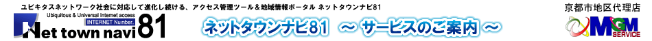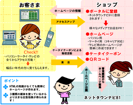 ネットタウンナビ81は、個人格差や地域間格差などにより生じるデジタルデバイド(情報格差)の解消を目的に開発された地域情報化支援ASPサービスです。ユビキタスネットワーク社会を目指す日本において、インターネットの利用環境はさらに複雑になってきています。パソコンや携帯電話を利用したインターネットアクセスに留まらず、家電製品やゲーム機など、様々な端末で利用できるようになってきました。"すべての人にインターネットを”をポリシーとしてすべてのインターネットユーザの立場に立ったインターネットアクセス環境の整備と、多様化するインターネット利用端末に対応したコンテンツの制作環境を提供しています。ポータル登録、PC/Mobile/TV版自動ホームページ生成、